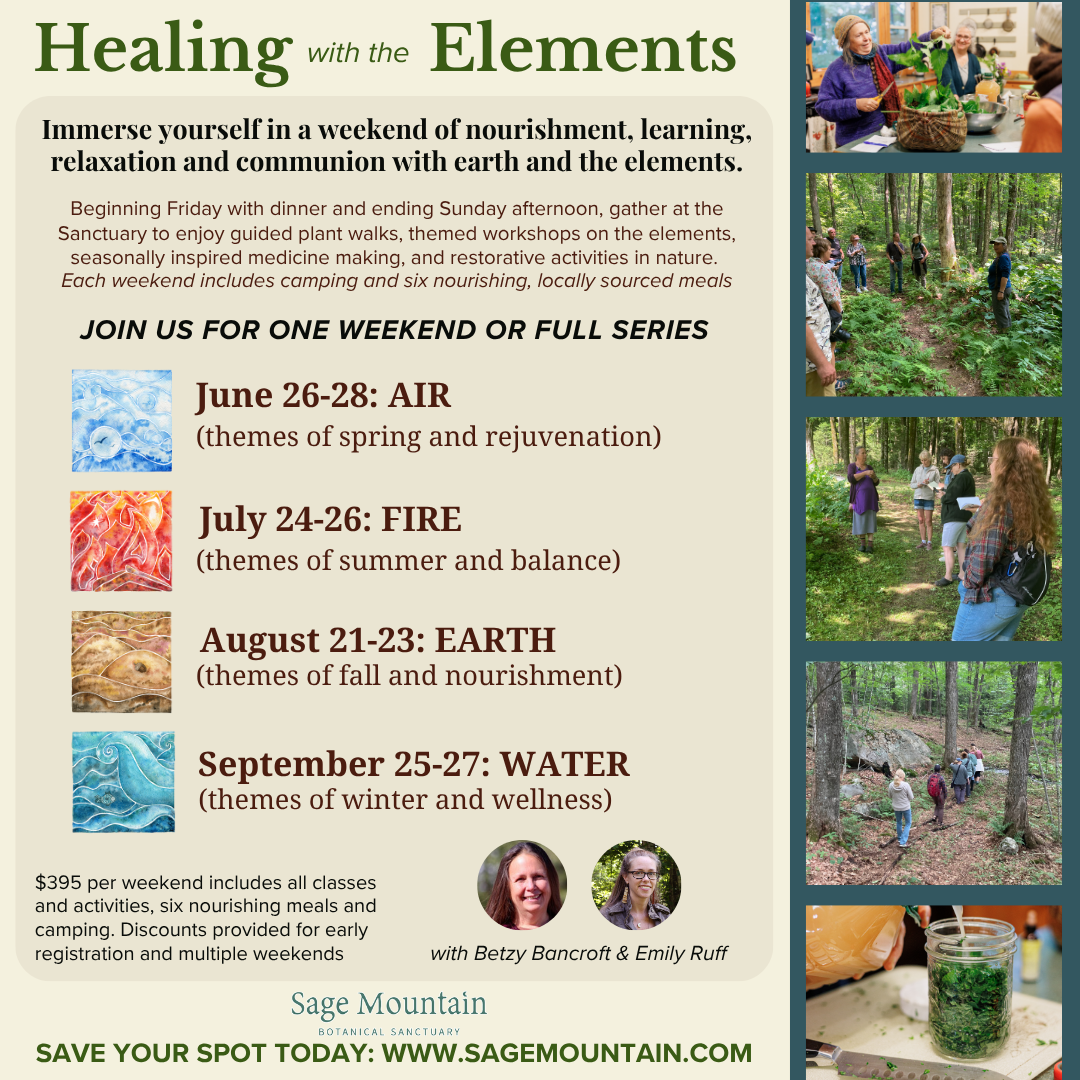 Join herbalists Betzy Bancroft and Emily Ruff for a weekend retreat to embark on a soulful, sensory exploration of the elements of nature. Each three-day weekend is focused on one element – earth, air, fire and water. Infuse yourself in the tranquility of nature and deepen your relationship to the healing power of the earth in this three-day Mountain retreat. Each weekend focuses on one of the four elements – air, fire, earth and water – to awaken our senses to the reflection of these healing forces in the land around us.